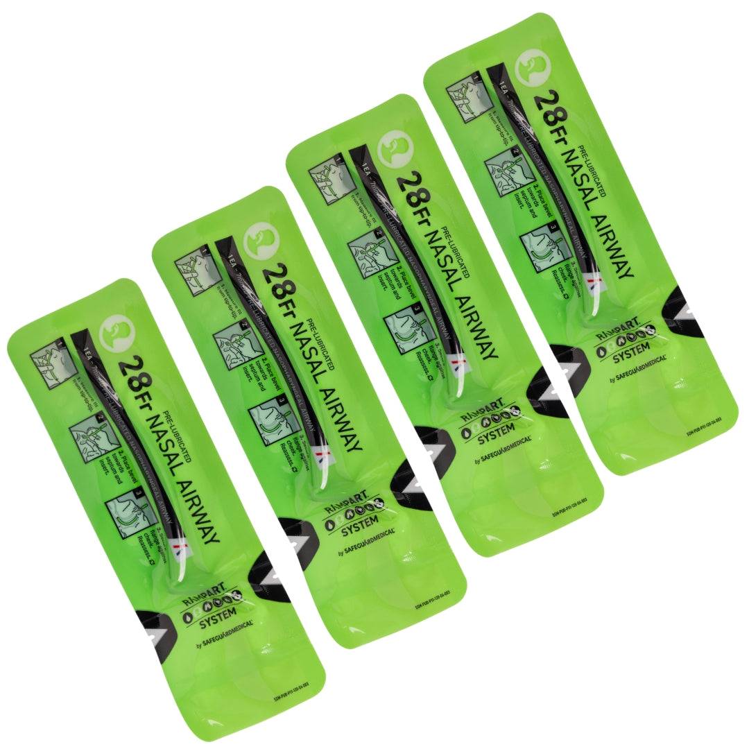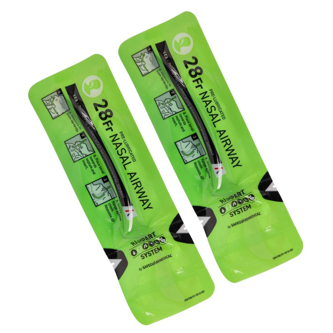 A nasopharyngeal airway (NPA) is a simple-to-insert medical device used to maintain an open airway by responders at all levels. The Pre-Lubricated Nasal Airway eliminates the lubrication step before insertion and is purpose-built for the pre-hospital environment. The unique flange is an external bevel indicator and serves as a securing feature to hold the device in place.